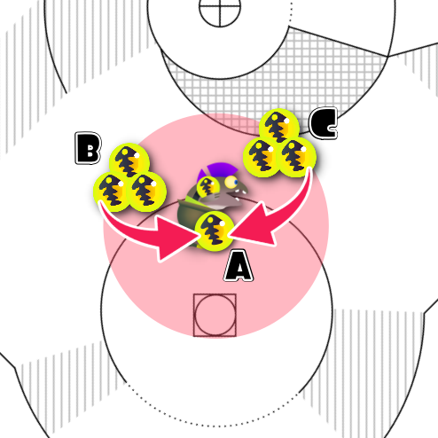 図のように始点Aにあらかじめ金イクラを"設置"した状態で周囲に金イクラを作り出すことで、タマヒロイが周囲の金イクラグループBやグループCから始点Aに集めていく。