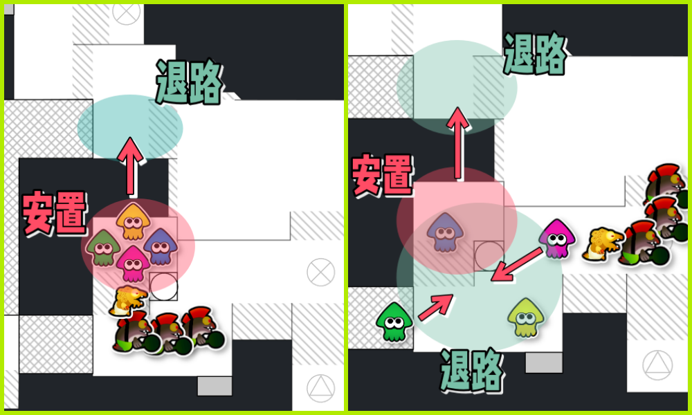 乱獲においては金イクラをより多く、そして素早く納品する必要があるため、通常プレイのように1本道にまとまるようにするのではなくコンテナの周辺で行う必要がある。